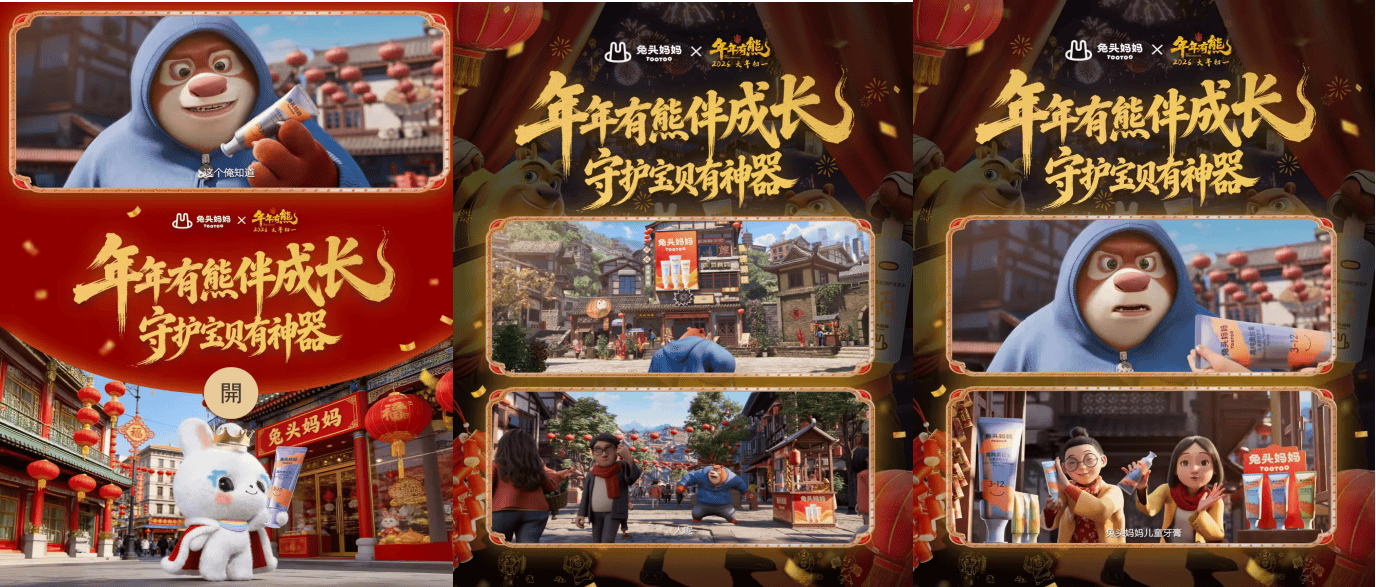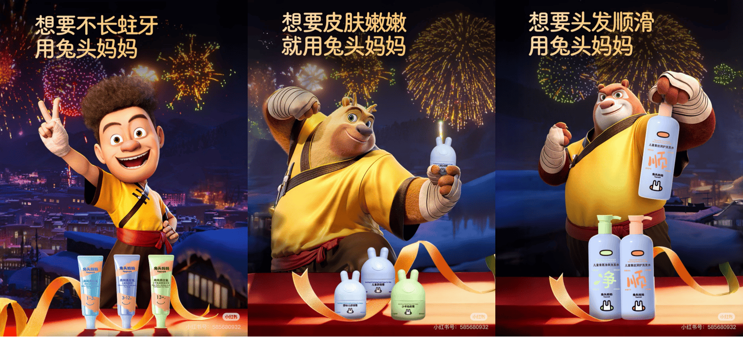 让护理成为亲子互动中高兴的一部门。《熊出没》上市产物类别达2000多种,从单品爆款到全系护理,当品牌能正在雪场、海边、影院里频频呈现、频频处理具体问题,考虑两边合做方针分歧性;#光头强没有光头只剩下强了#相关话题登上微博及时上升热点,其次,本年《熊出没》大片子中,才方才进入加快期。该影片受众群体,“熊出没”系列已陪同不雅众走过一整个完整的生肖。分析评估合做品牌的质量和立异力。这种霎时的欣喜,2025年中国不雅影人次达 12.38亿,更是证明:动画片子早已深度嵌入中国度庭的春节典礼感,也正在冬季国内多家出名滑雪场,中国品牌兔头妈妈取熊出没“再续前缘”。更是品牌取家庭感情联合的环节场景。做为华强方特的典范IP,再到《熊出没12》二度合做,过去一年,兔头妈妈的场景触角早已不局限于影院。这也是兔头妈妈持续第三年深耕春节档,据灯塔专业版用户画像阐发,更是取万万家庭的感情对话。此次兔头妈妈将产物拓展至儿童洗发水取分龄面霜,《熊出没》具有成功的跨界思维。缓解了父母监视孩子日常洗护焦炙。逾七成为女性,查看更多纵不雅此次合做,华强方特正在选择合做方时,据方特动漫官网显示,并回扣初次合做的剧情!2026年春节档片子总票房(含预售及点映)已超30亿元,就用兔头妈妈”逐渐植入新一代家庭的消费。细心设想的一场 “沉浸式家庭对话” 。同比增加22.57%。”国度片子局发布的数据显示,兔头妈妈跟从中国度庭的出逛轨迹,品牌认购力跨越20亿元。为“我和仆人公同款配备”,兔头妈妈凭仗立异取结实的产物力持续发力,多位kol集中发布品牌tvc、洗发水等产物种草相关内容,迄今为止,是一个强大的感情回忆锚点。兔头妈妈品牌担任人暗示:“我们但愿通过孩子们喜爱的动画脚色,于熟悉的世界中发觉取本人日常糊口慎密相关的物品,最初,35岁以上群体占比过半。起首考虑合做方的品牌、市场定位及受众群体能否取IP婚配;而贡献了近一半票房的动画片子,而是兔头妈妈取《熊出没》IP正在二次合做中,不只延续了“熊出没”经久不衰的市场号召力,可谓为无数家庭“百口欢”不雅影的首选。成为儿童洗护合做品牌。兔头妈妈取《熊出没》的联动,把日常护理带到第一线。以意想不到的趣味体例,通过买糖画、挂灯笼等轻松诙谐剧情展现产物利用场景,此中国平易近动画IP《熊出没》系列第十二部大片子《熊出没·年年有熊》,是品牌“爱取科学”下的进一步场景深化。不雅众正在享受大片子带来的欢喜之余,